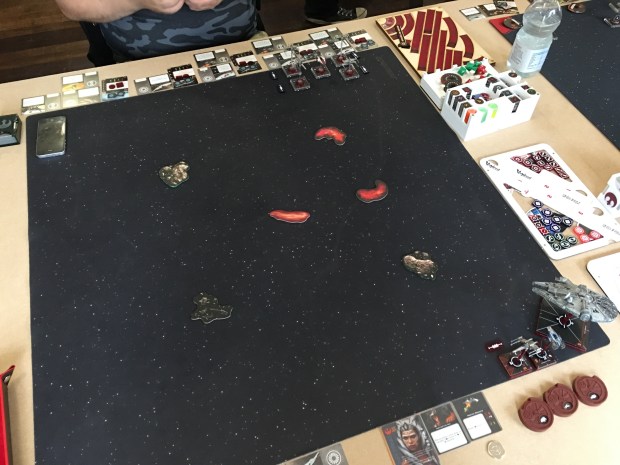 Another Rebel list? Interesting. Not only another rebel list but one that contains two out of three of the pilots I’m flying too! I knew that 2 point bid would come in handy… I made Andrew first player. Sorry, not sorry! Andrew started top right and I bottom left with the same plan as before – to entice his forces through the obstacles.